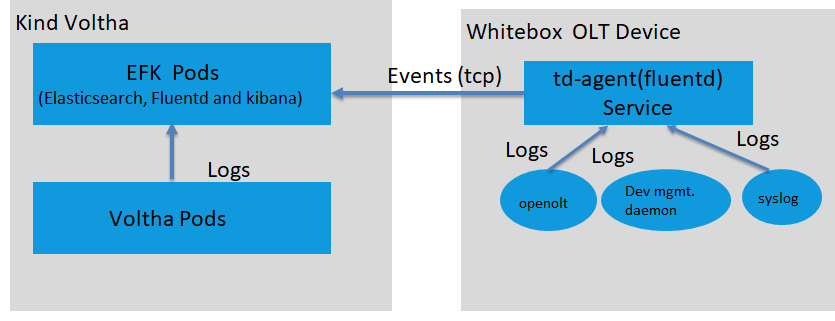 Below diagram depicts the log collection from voltha components and whitebox OLT device through EFK.The fluentd pod running collects logs from all the voltha components and push to elasticsearch pod. The td-agent(fluentd variant) service running on whitebox OLT device capture the logs from openolt agent process, device mgmt daemon process and system logs and transmits the logs to the elasticsearch pod running in voltha cluster over tcp protocol.
