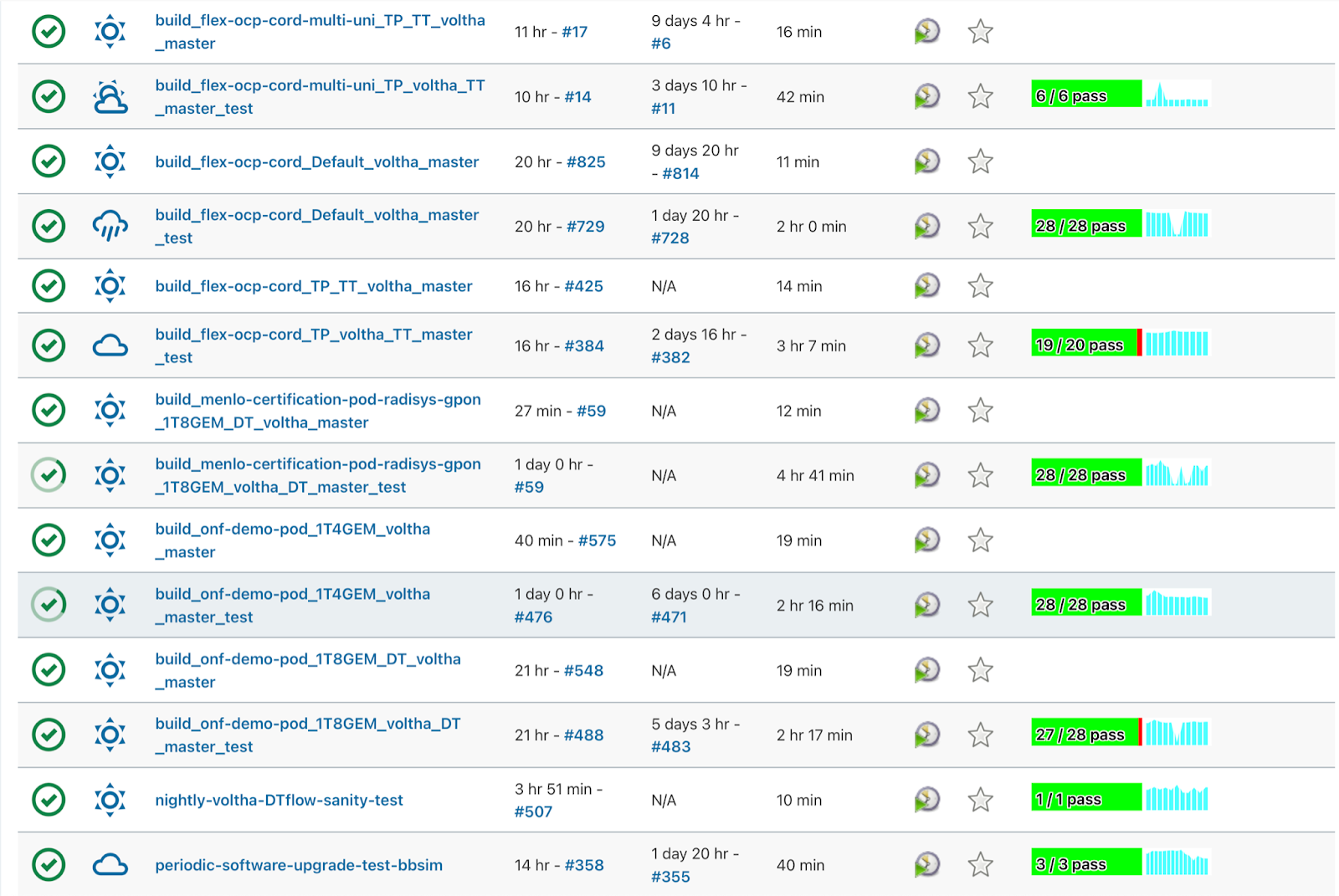 OpenCord Jenkins host various regression jobs that runs on the ONF physical pods situated at different geographical locations. Hardware jobs test both control and dataplane functionality of Voltha.